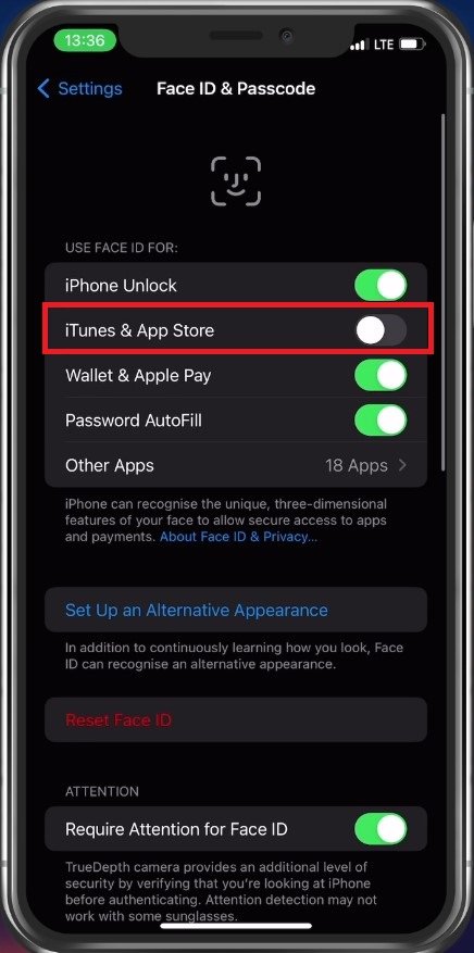 Öppna dina inställningar. Härifrån trycker du påFace ID och lösenord. Fortsätt med att ange ditt lösenord och du kan sedan inaktivera växlingen föriTunes & App Store.