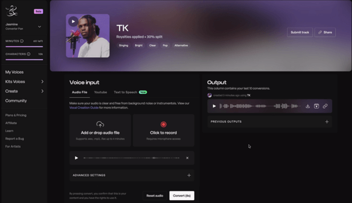 | AI-satser | 90-tals rapsång, rå leverans | Gratis, 9,59 USD/månad (omvandlare), 19,99 USD/månad (skapare), 47,99 USD/månad (Kompositör) | Webbaserat |
