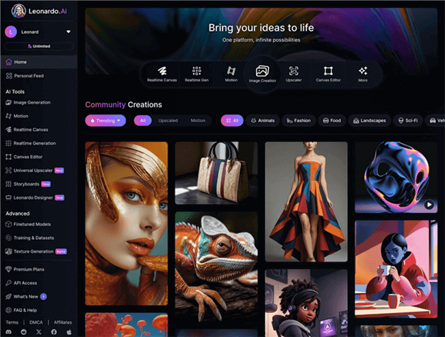 Med sina avancerade AI-bild- och videogenereringsmöjligheter är Leonardo AI en banbrytande plattform som försöker revolutionera kreativa företag. Det låter användare producera överlägset AI-drivet innehåll i en mängd olika branscher, som grafisk design, marknadsföring och fotografi. Oavsett om det gäller att förbättra visuell marknadsföring eller experimentera med nya konstnärliga tekniker, erbjuder Leonardo AI anpassningsbara lösningar för alla scenarier.