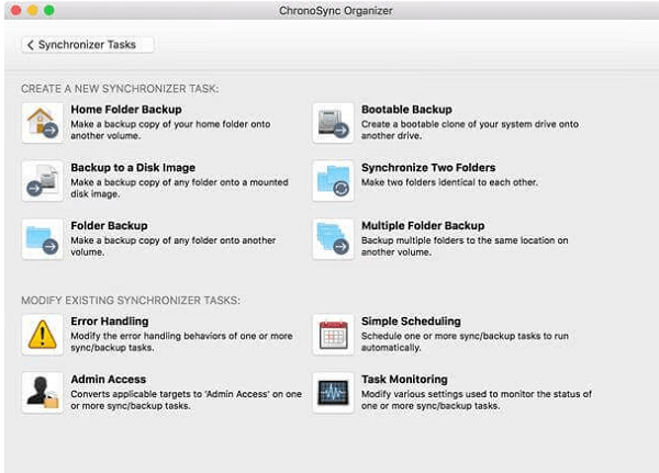 För smärtfri säkerhetskopiering och återställning av data,ChronoSyncär ett bra alternativ för dig. Detta allt-i-ett-verktyg för säkerhetskopiering låter dig importera viktig data från din Mac-dator till dess virtuella utrymme där den lagras säkert tills vidare. Att hämta säkerhetskopierade data är enkelt och snabbt via detta verktyg.