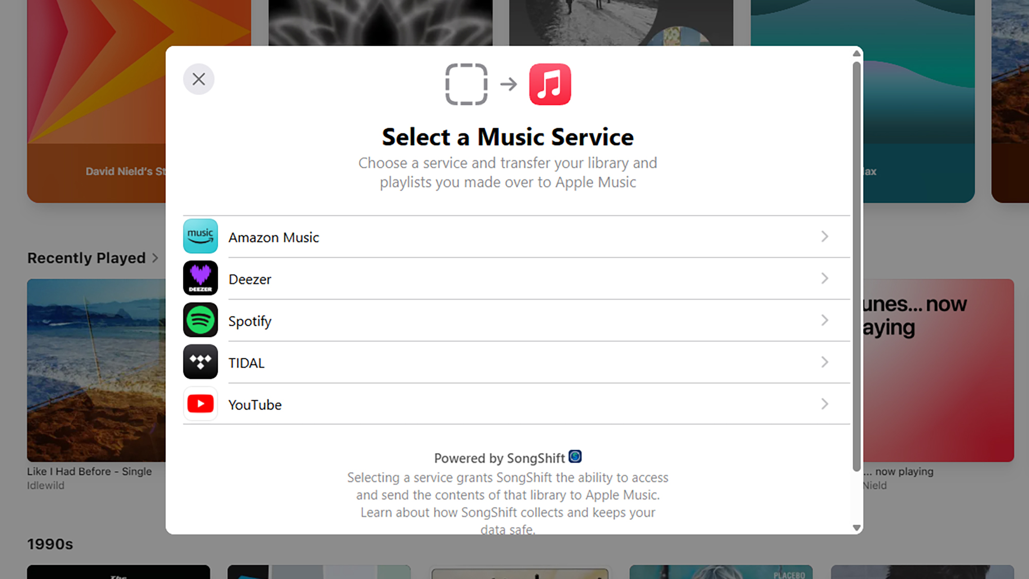 Du kan också överföra musik på webben. Skärmbild: AppleEtt ord av varning: Överföringsprocessen är inte alltid sömlös, och det kan ibland finnas låtar som finns på en tjänst men en annan (särskilt när det kommer till YouTube, som har många live- och sällsynta inspelningar).