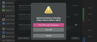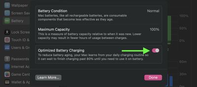 I macOS Big Sur och senare inkluderar Apple en intelligent funktion som är utformad för att lära av dina laddningsvanor och förbättra batteriets livslängd genom att minska tiden som din bärbara Mac är fulladdad.