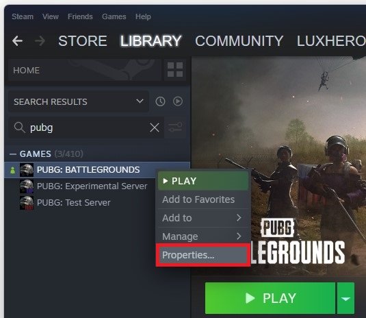 Steam-bibliotek > PUBG-egenskaper > Lokala filer > Verifiera spelfilers integritet