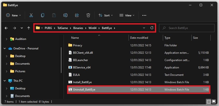 Installera omBattleEyeansökan för PUBG. Öppna dinFilutforskarenoch navigera till enheten där du spararÅngaspel på. Navigera till:Programfiler>Ånga>steamapps>gemensam>PUBG>TslGame>Binärer>Win64>BattleEye. Dubbelklicka påUninstall_BattlEyebatchfil och fortsätt med avinstallationen. Dubbelklicka påInstall_BattlEyefilen för att installera om den.