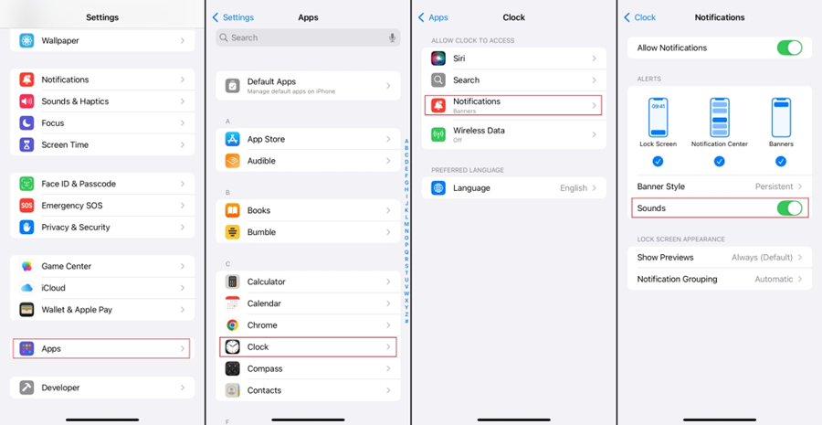 Klockavisering är också en vanlig faktor som påverkar iPhone-larmljudet. Om du stänger av aviseringsljudet för Klocka, kommer inte ditt alarm att utlösas heller.