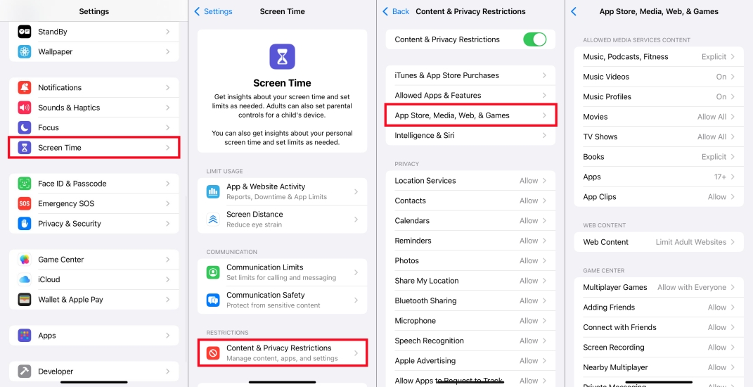 Steg 1.LokaliseraInställningaroch tryckSkärmtid > Innehålls- och sekretessbegränsningar.