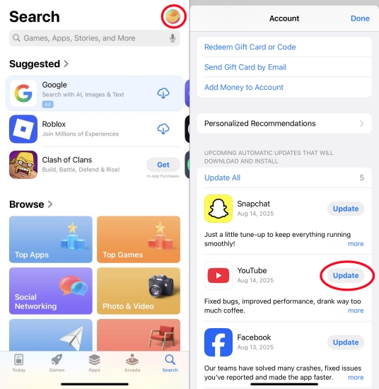 Steg 2.Leta upp uppdateringar och tryck påUppdaterabredvid YouTube.