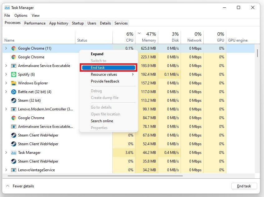 Öppna upp dinTask Managergenom att söka efter det i din startmenysökning. I denProcesserse till att avsluta program från att köras som kan ändra dina spelfiler eller visa en överlagring medan du spelar spelet. I vårt exempel skulle det vara CCleaner, GeForce Experience, Adobe-applikationer, Discord och Chrome.