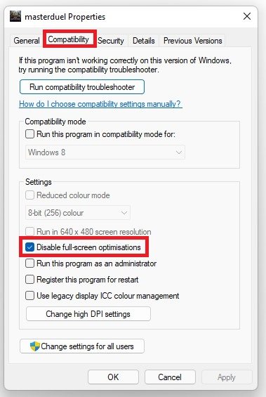 Inaktivera helskärmsoptimeringar för Yu-Gi-Oh!