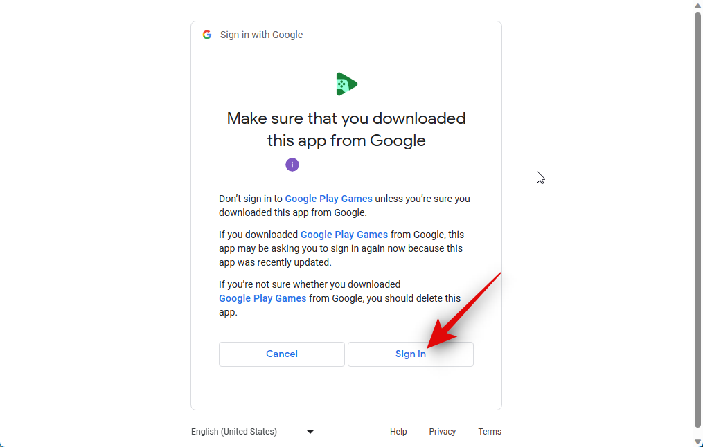 När du väl har valt ett konto kommer du att uppmanas att se till att du laddat ner Google Play Games från den officiella webbplatsen. KlickLogga inför att bekräfta ditt val.