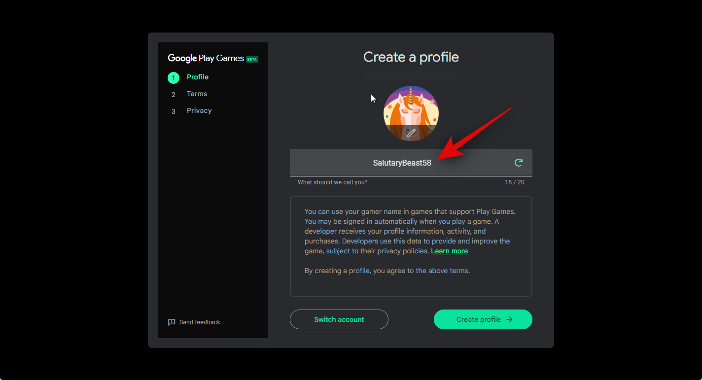 Du kommer nu att bli ombedd att skapa en profil som ska användas med Google Play Spel. Skriv in ditt föredragna användarnamn i textrutan högst upp.