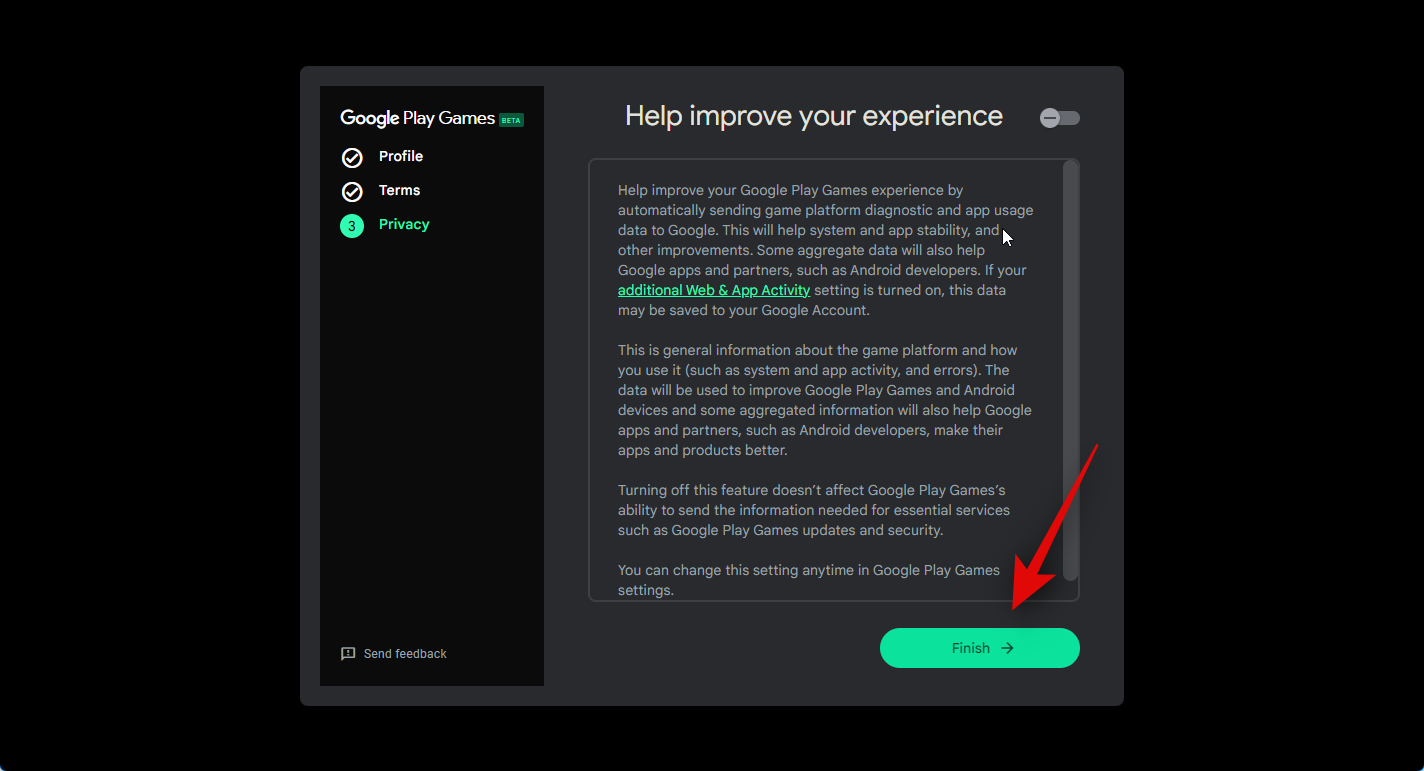 Du kommer nu att bli tillfrågad om du vill dela anonym data med Google för att hjälpa den att förbättra sina appar med framtida uppdateringar. Klicka och aktivera reglaget i det övre högra hörnet förHjälp till att förbättra din upplevelseför att dela din data med Google. Inaktivera den här växeln om du inte vill dela din data.