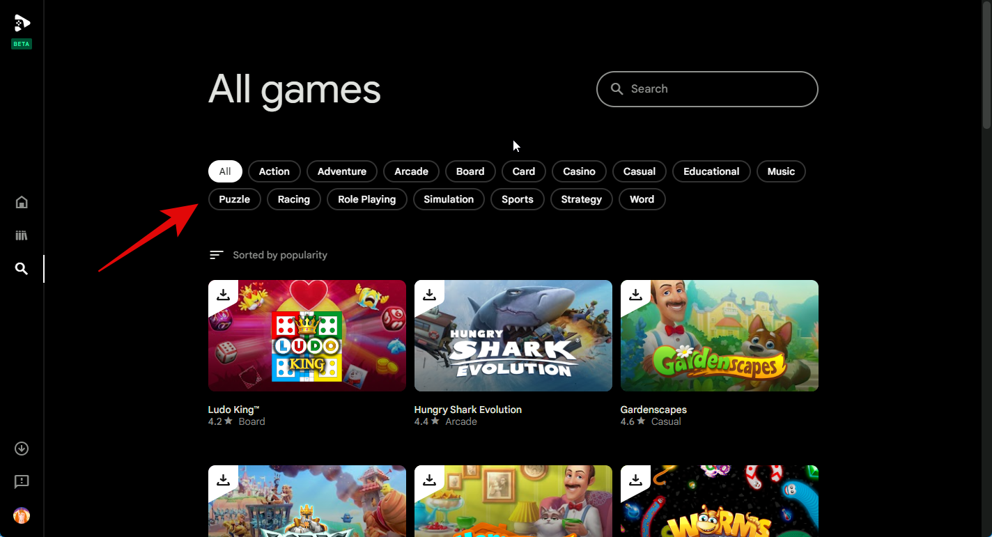 Om du vill söka efter ett spel, klicka påSökaikonen i det vänstra sidofältet.