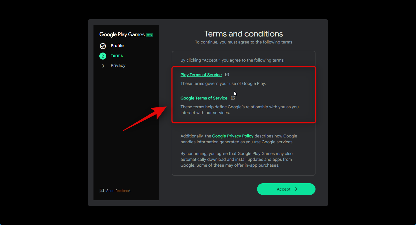 Du kommer nu att se användarvillkoren för Google och Google Play. Granska båda med hjälp av deras respektive länkar högst upp.