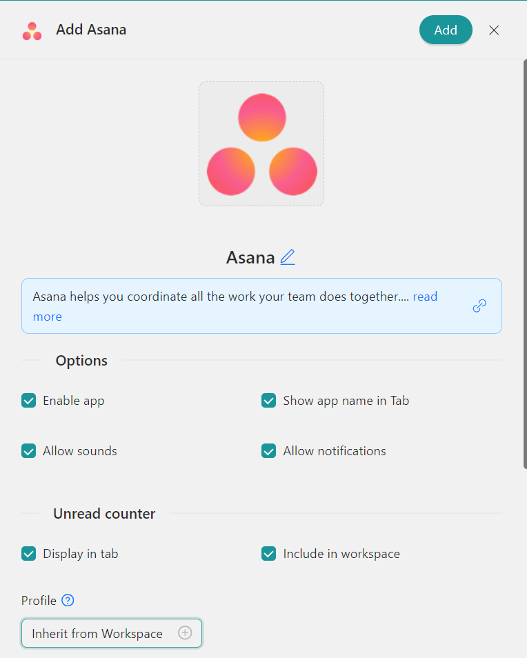 - Configure los ajustes de la aplicación según sus necesidades. También puede elegir qué perfil usar (heredado del espacio de trabajo, principal, privado, de incógnito o un perfil personalizado).