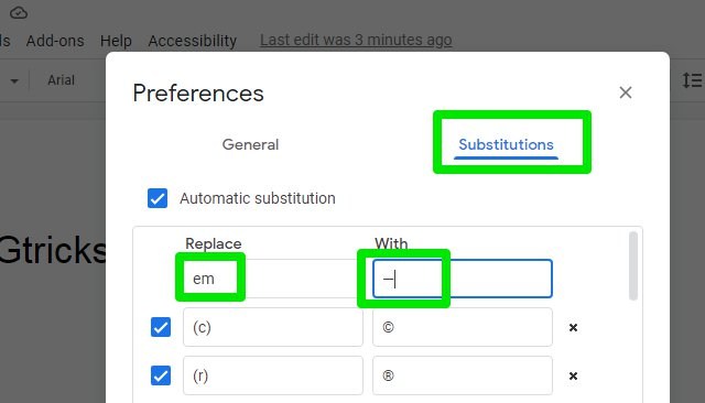 Además de estos dos métodos, también puedes crear una regla de sustitución en Google Docs para ingresar el guión en función de un acceso directo personalizado. Por ejemplo, puede decirle a Google Docs que ingrese un guión largo donde quiera que ingrese dos guiones (como Microsoft Word). He aquí cómo hacerlo:
