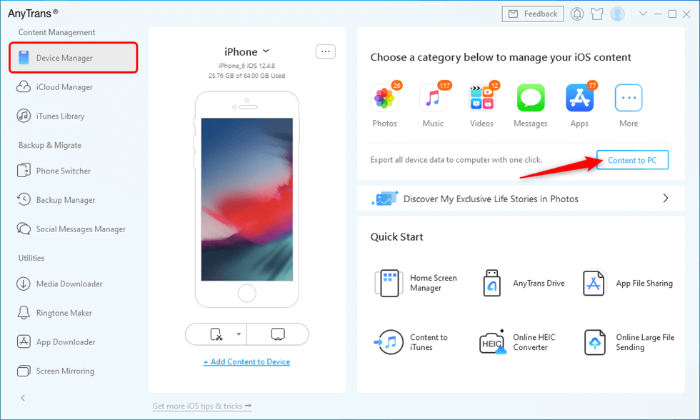 Ahora, veamos cómo puedes hacer una copia de seguridad de un iPhone deshabilitado en tu computadora con AnyTrans.