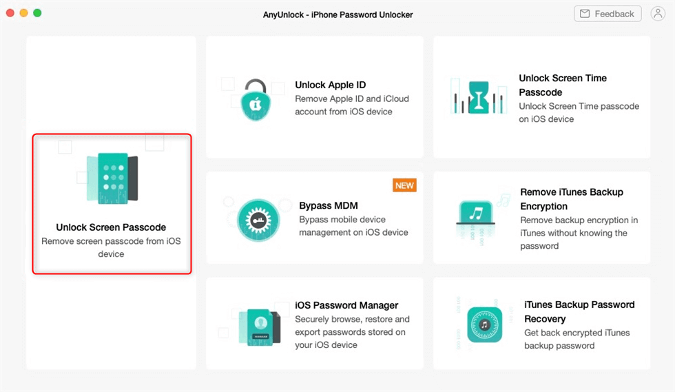 Paso 1. Descargue e inicie AnyUnlocken su computadora y conecte su iPhone a ella. Cuando AnyUnlock haya detectado su dispositivo, haga clic enDesbloquear contraseña de pantalla.