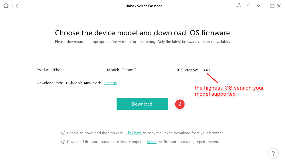 Paso 2.Siga las instrucciones en pantalla paraponga su dispositivo iOS en modo de recuperación> Descargue el firmware de iOS, esto es para desbloquear el código de acceso de la pantalla. Es posible que la descarga del paquete tarde mucho tiempo, así que tenga paciencia.