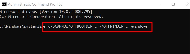 Paso 4:Insertarsfc/SCANNOW/OFFBOOTDIR=c:/OFFWINDIR=c:ventanasy haga clicIngresar.