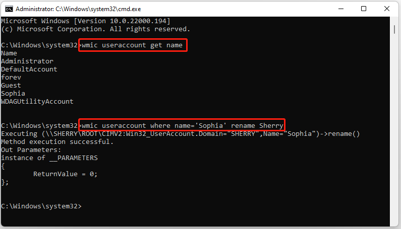 Paso 4. Escriba "cuenta de usuario wmic donde nombre = "Sophia" cambie el nombre de Sherry". (Reemplace "Sophia" con su antiguo nombre de cuenta; Reemplace "Sherry" con su nuevo nombre de cuenta). Luego presione "Entrar" para ejecutar el comando.