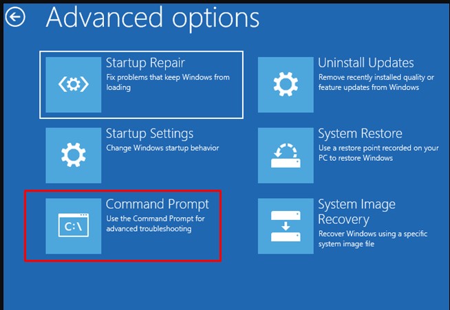 Paso 4:Hacer clic enSolución de problemas – Opción avanzada – Símbolo del sistemay asegúrese de que el comando esté enC:/ventanas/sistema32.