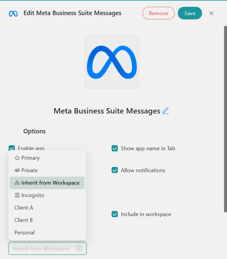 - Espacios de trabajo de Rambox: Cree paneles personalizados (llamados Espacios de trabajo) para cada cliente o proyecto.Cada espacio de trabajo actúa como un entorno independiente con su propio conjunto de aplicaciones., por ejemplo, uno podría incluir Metricool, Meta y Gmail para las redes sociales del Cliente A, mientras que otro podría combinar Twitter, Buffer y Drive para las redes sociales del Cliente B. Puedes cambiar entre ellos instantáneamente, manteniendo todo separado y organizado sin abrir nuevas ventanas.