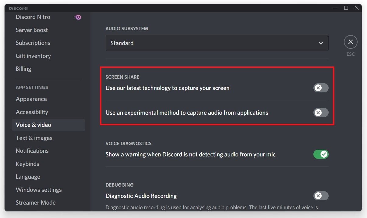 Si aún ve el problema de compartir la pantalla negra, continúe con el siguiente paso: deshabilitar la opción de última tecnología. Para hacerlo, navegue hasta elConfiguración de usuarioicono en la parte inferior izquierda de su ventana. Desplácese hacia abajo en el menú del lado izquierdo. bajo elConfiguración de la aplicación, encontrarás elVídeo y vozopción. BajoDiagnóstico de vozdesactivar elUtilice nuestra última tecnología para capturar su pantallayUtilice un método experimental para capturar audio de juegosopciones alternando sus interruptoresAPAGADO.
