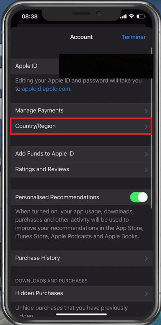 SeleccionandoVer cuentaLe pedirá que use su contraseña o Face ID para mostrarle la información de su cuenta. TocaPaís / Región. Después de un segundo, seleccioneCambiar país o región.