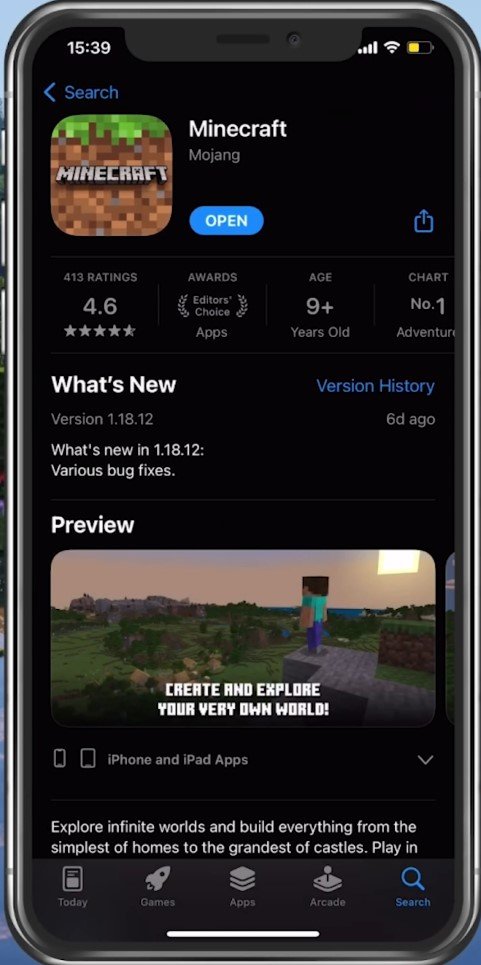 Busca Minecraft Pocket Edition y selecciona el primer juego. Proceda a descargar la aplicación. Puede abrirlo una vez completada la instalación, lo que debería tardar unos minutos en completarse.