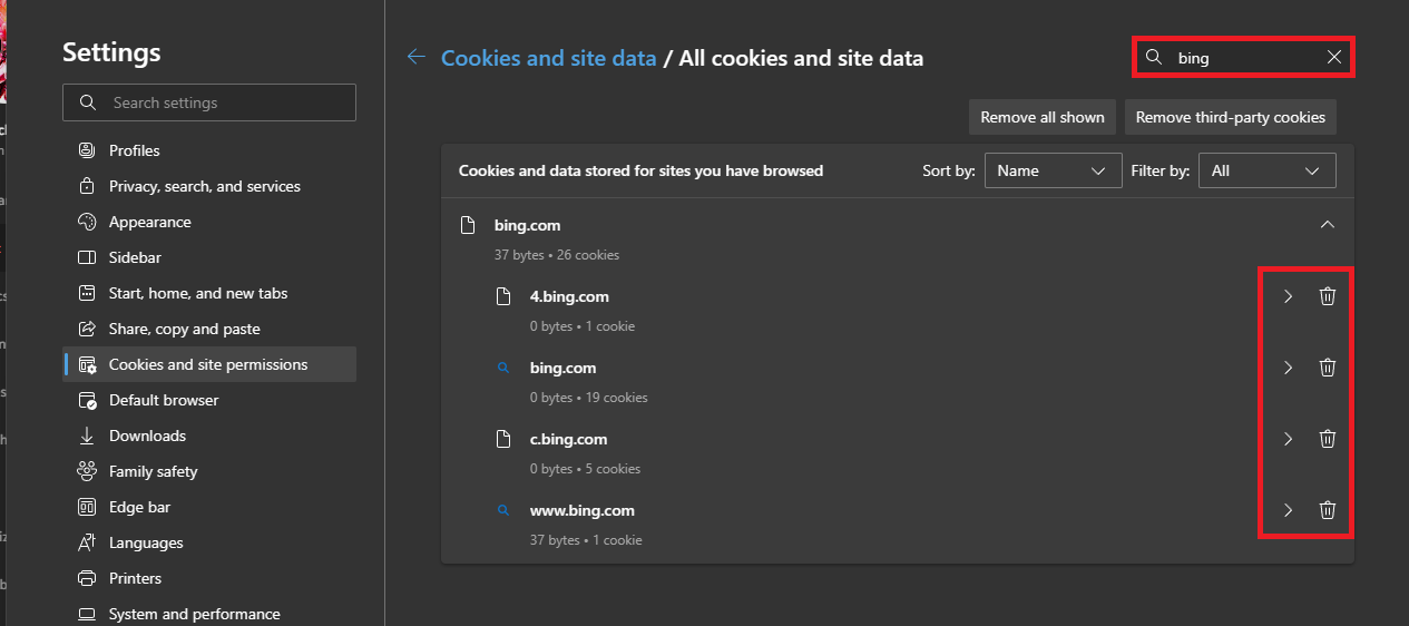 Navegador Microsoft Edge > Cookies y permisos del sitio > Eliminar datos almacenados de Bing