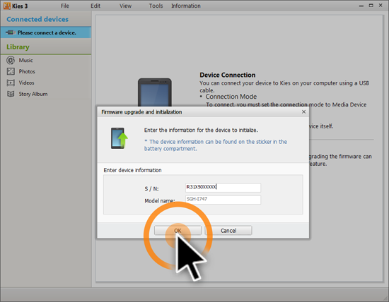 Paso 3: Ahora, ingresa el modelo y el número de serie en Kies.