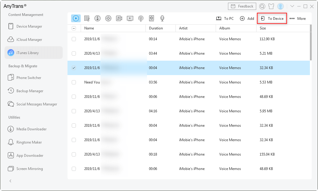 Paso 2. Toda la música en tu iTunes aparecerá en el panel> Selecciona las canciones que no se pueden sincronizar con el iPhone/iPad/iPod> Haz clic en el botón Al dispositivo para transferir música de la biblioteca de iTunes al iPhone/iPad/iPod nuevamente.