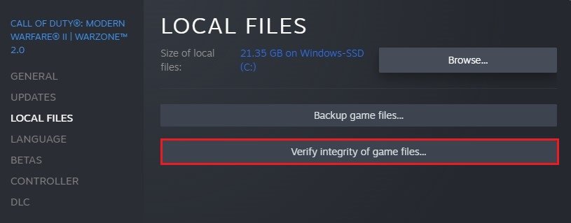 Propiedades de Modern Warfare 2 > Archivos locales > Verificar integridad