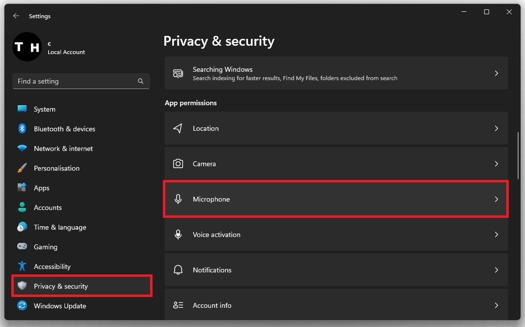 Si su micrófono aún no está en la lista de micrófonos disponibles, o si aún recibe el error de no detectar el micrófono, asegúrese de cerrar Zoom y abrir la configuración de Windows. En elPrivacidad y seguridadsección, desplácese hacia abajo y debajoPermisos de aplicaciones, seleccionarMicrófono.