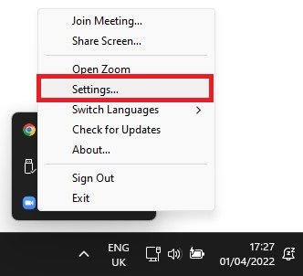 Abra Zoom y, en caso de que no pueda encontrar la ventana, abra la bandeja del sistema y haga clic derecho en el icono de Zoom para acceder a su configuración.