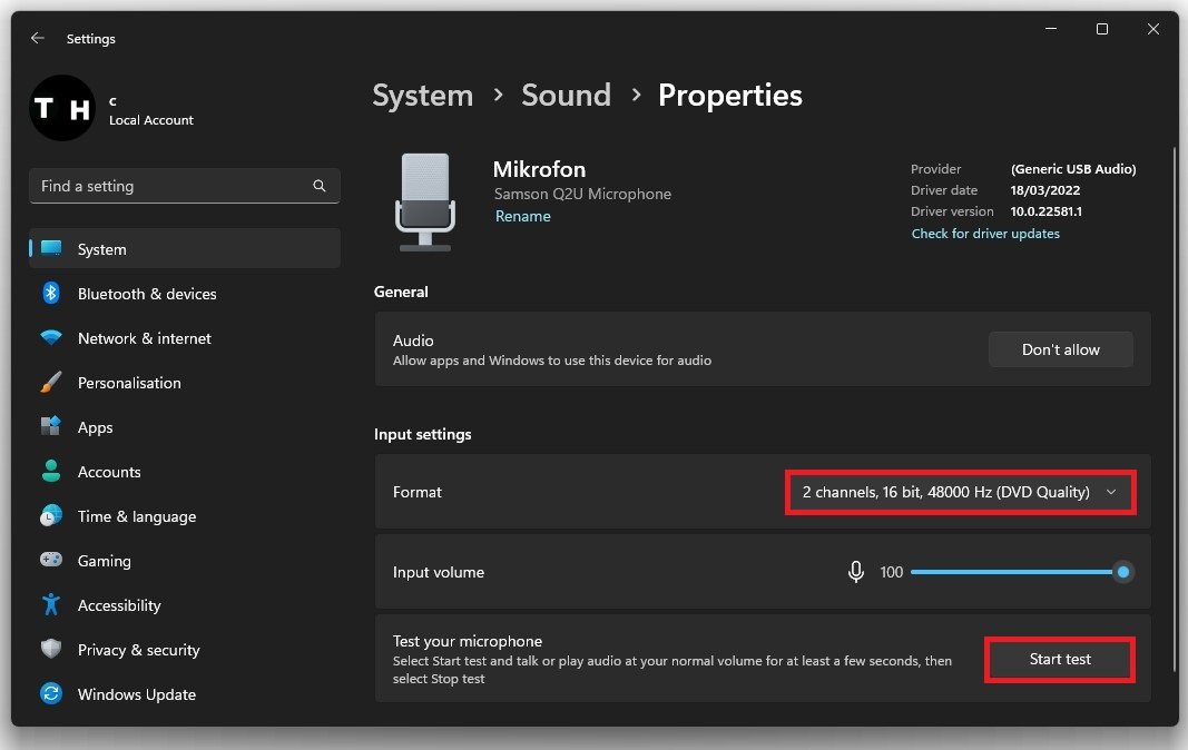 Seleccione el micrófono que desea utilizar y configure suFormatoa2 canales 48'000Hz o44’100Hz, el que esté disponible para usted.