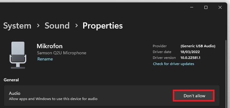 Desactive todos los demás micrófonos que permita que Windows utilice. En sus dispositivos de entrada, seleccione un micrófono diferente y seleccioneNo permitir.