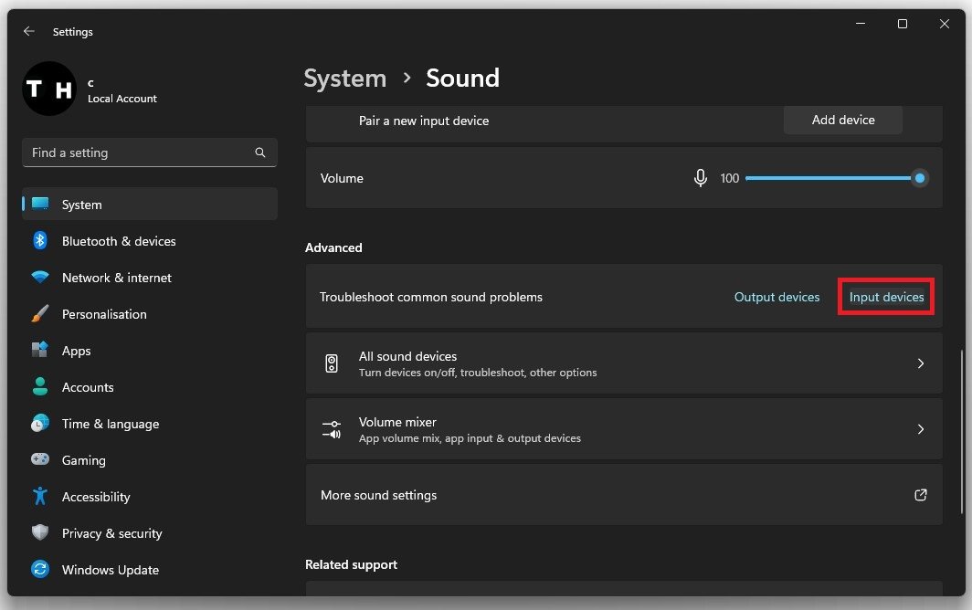 Ejecute el solucionador de problemas para dispositivos de entrada. De vuelta en tuSonidoconfiguración, desplácese hacia abajo y, en la sección avanzada, seleccioneSolucionar problemas de sonido comunespara dispositivos de entrada. Esto tomará un momento para descubrir qué podría estar mal con su micrófono.