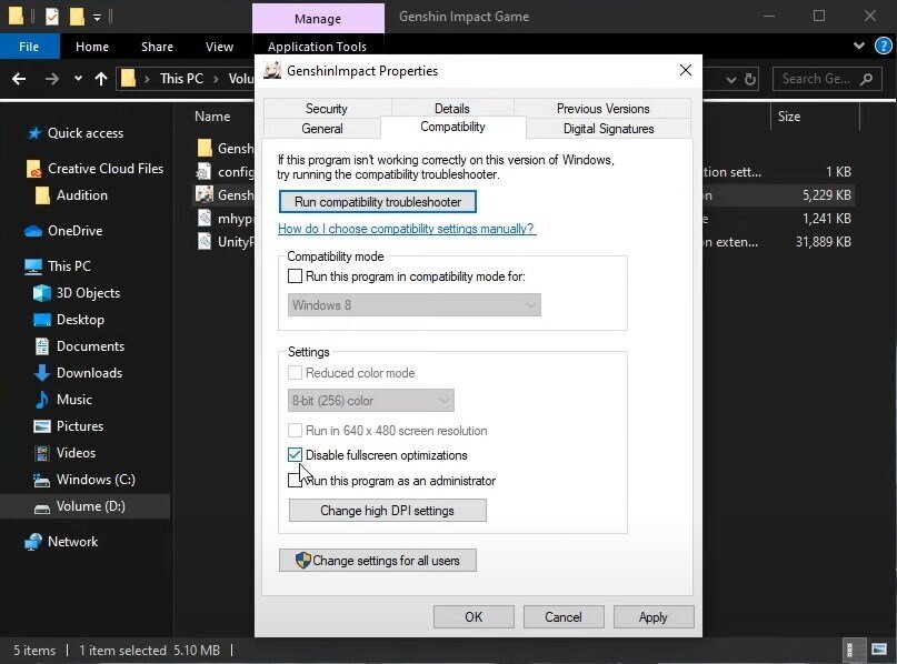 Ajuste de la configuración de compatibilidad de Genshin Impact