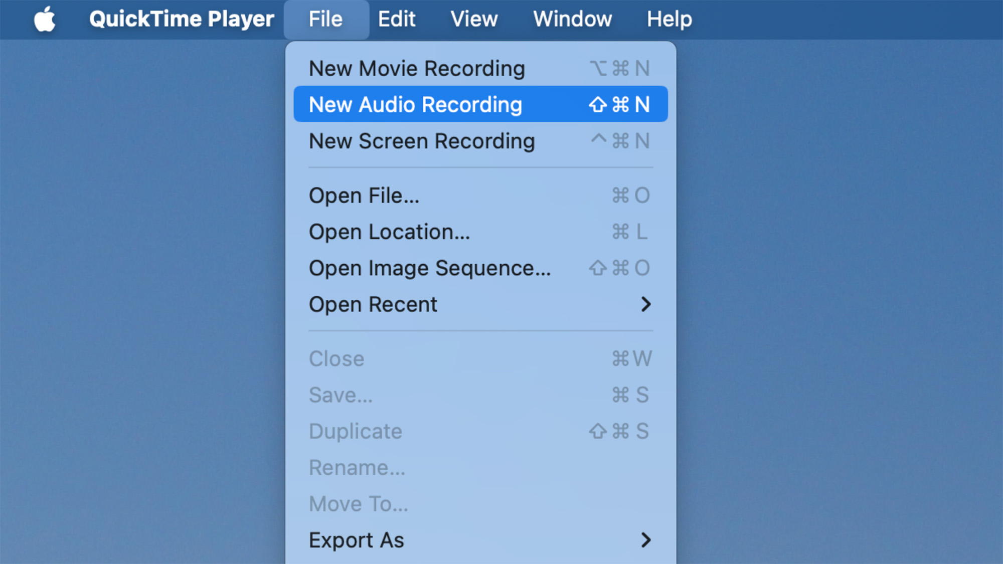 Desafortunadamente, no es tan fácil amplificar la voz con un micrófono y una computadora Mac, pero existe una solución sencilla. Abra el reproductor QuickTime, vaya aArchivoen la barra de menú y haga clic enNueva grabación de audio.