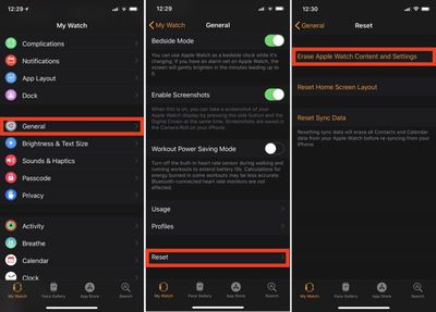 Si olvida su contraseña de Apple Watch, deberá borrar el dispositivo y luego restaurarlo desde una copia de seguridad. Puede realizar esta acción iniciando la aplicación Watch en su iPhone emparejado: toque elmi relojpestaña si aún no está seleccionada, toqueGeneral -> Restablecer, luego seleccioneBorrar contenido y configuración de Apple Watch.