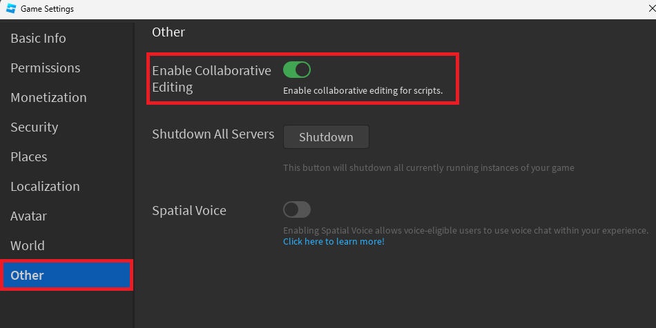 En la sección "Otro", asegúrese de habilitar la opción Edición colaborativa, que también permitirá a los usuarios editar scripts de Roblox Studio.