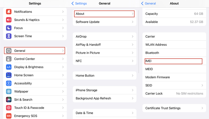 Paso 3.Desplácese hacia abajo y toqueIMEIpara verificar el número IMEI en su iPhone.