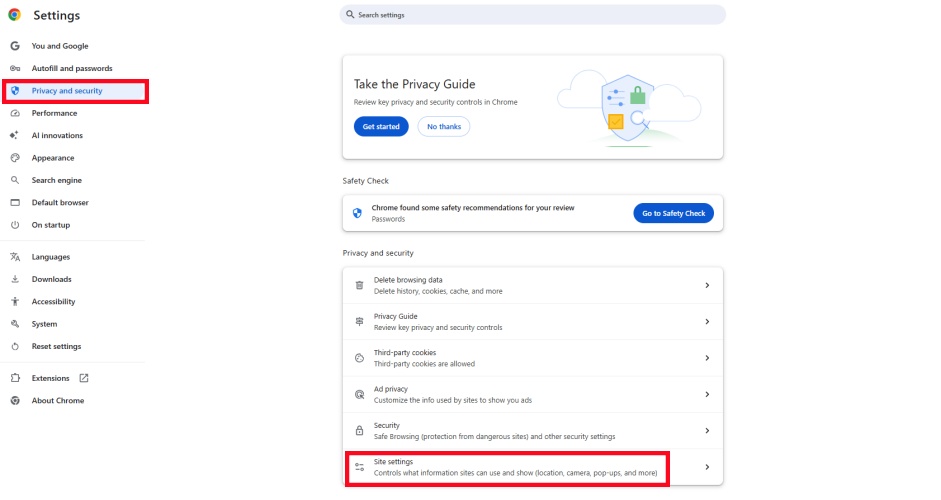 Paso 2.Luego golpeaConfiguración > Privacidad y seguridad > Configuración del sitio.