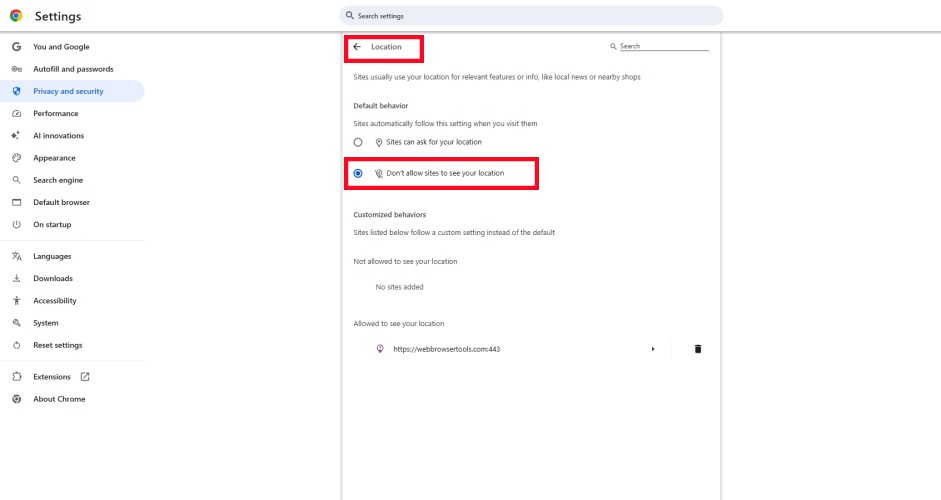 Paso 3.SeleccionarNo permita que los sitios vean su ubicaciónbajoUbicación.