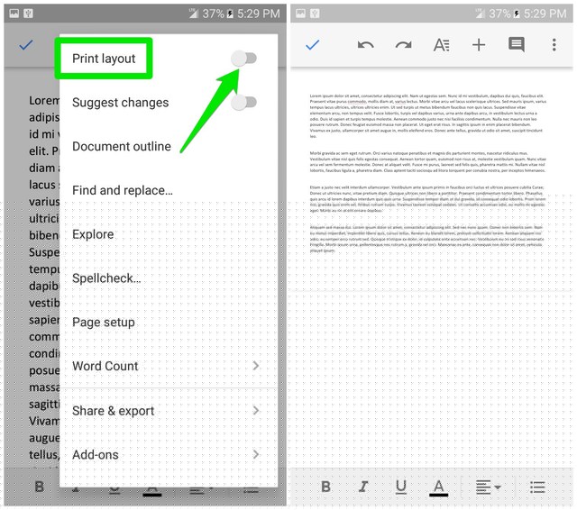 La orientación del documento cambiará a horizontal. Sin embargo, para verlo en su teléfono, deberá habilitar Diseño de impresión. Para hacerlo, toque el botón de menú nuevamente y seleccione“Diseño de impresión”.