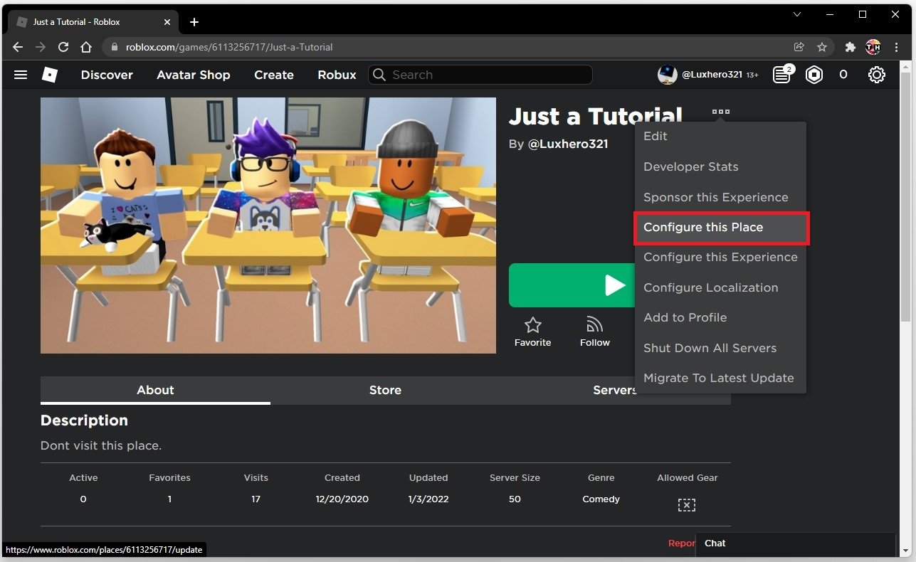 BajoCreaciones, selecciona dónde quieres cambiar la configuración del juego y haz clic en la hamburguesa en la parte superior derecha. Al seleccionarEditar, Roblox Studio se abrirá con tu lugar.