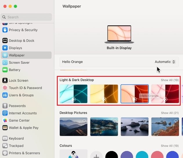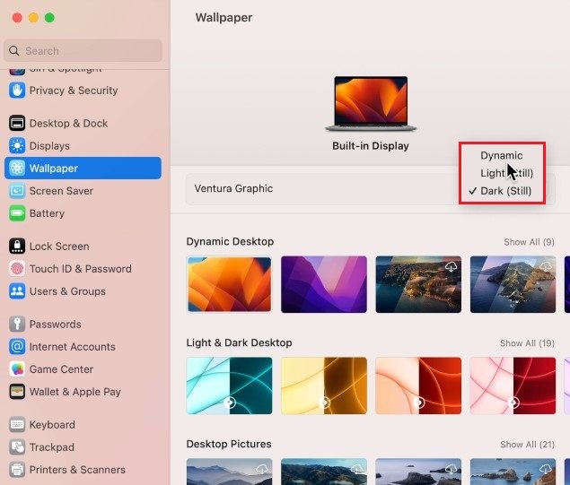 Navega hasta elPapel pintadosección. Aquí puede seleccionar diferentes tipos de fondos de pantalla. ElEscritorio dinámicoEl fondo de pantalla se puede configurar en una versión clara u oscura. También tiene la opción de configurar esta opción enDinámica. El fondo de pantalla del escritorio cambiará según la hora del día y la ubicación. Todos los fondos de pantalla en esta primera fila tienen una configuración dinámica, aunque algunos deben descargarse primero.