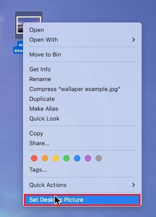 Alternativamente, puede hacer clic derecho en cualquier imagen en suDescubridoro escritorio y seleccioneEstablecer imagen de escritorio. Esto cambiará su fondo de pantalla a la imagen seleccionada sin tener que buscarla en su configuración.